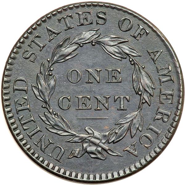 1820 N-7 R2 EF40. EF-40. Ten points sharper but dark with rather uniform extremely fine roughness. The only roughness visible without a strong glass is some very light pitting above star 4. No verdigris or notable contact marks. Slightly glossy dark olive and steel. EDS. The dentils, legends, and inner circle are all sharp and there are no die cracks or flowlines on either side. DWH #3135.