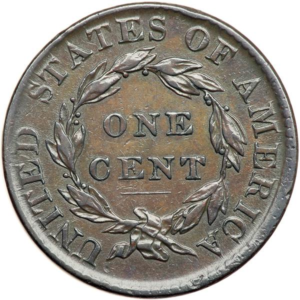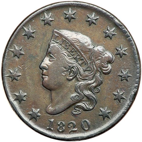 1820 N-7 R2 VF20. VF-20. Ten points sharper with several light rim bruises, the stronger ones at star 9 and below the 2 in the date. Recolored a glossy olive brown and chocolate. LDS with an additional die crack down from the dentils through the right side of star 7 to LI in LIBERTY. The reverse center dot is not gone. DWH #0512.