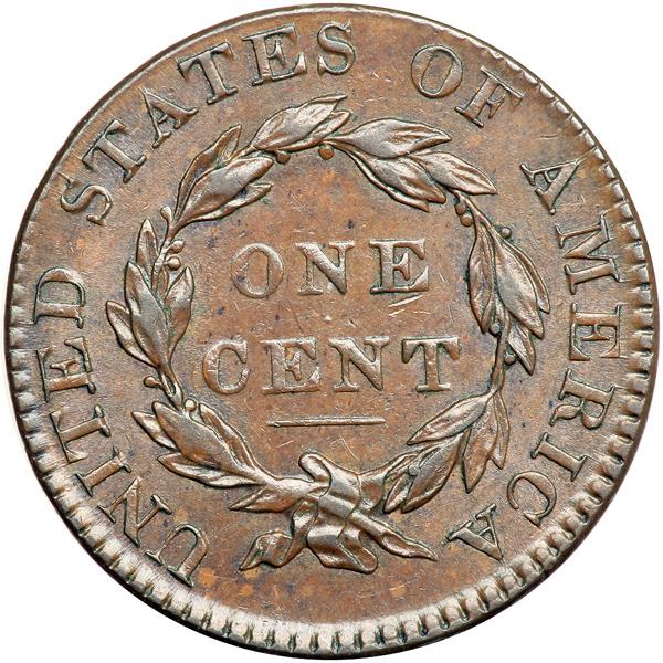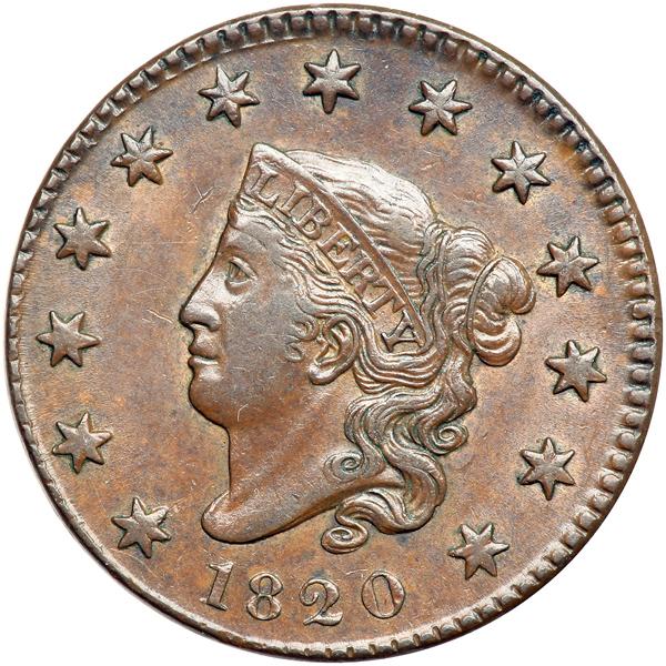 1820 N-8 R3- EF45. EF-45. Glossy light steel brown with darker steel brown toning on the highpoints and frosty mint luster covering the protected areas. Sharp and attractive offering excellent eye appeal. A tiny nick in the field off the forehead and another under the E in ONE are the only notable marks. MDS with fine radial die flowlines covering the fields and the tops of the reverse legend drawn to the rim. Struck slightly off center to K-7. Called EF40 and tied for CC#13 in the Noyes census, his photo #37232. DWH #0513.