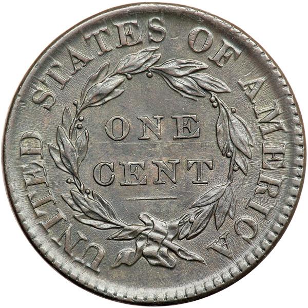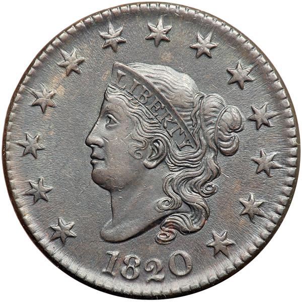 1820 N-9 R3 EF45. Large Date. EF-45. Frosty olive and dark chocolate brown with flashy flowline luster covering the fields and protected areas. There are a few small splashes of lighter brown toning around stars 4 & 5 and a faint horizontal hairline scratch under ONE. Rare LDS. Die cracks extend from the bust to the left top of the 8, from the bust tip into the field towards star 1, and a relatively strong one from the chin into the field towards star 1. Called EF45 net EF40 and tied for CC#5 in the Noyes census, his photo #38478. DWH #2656.