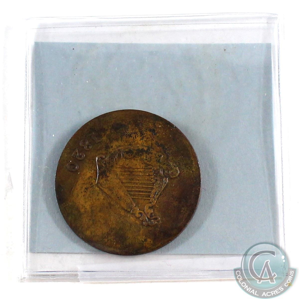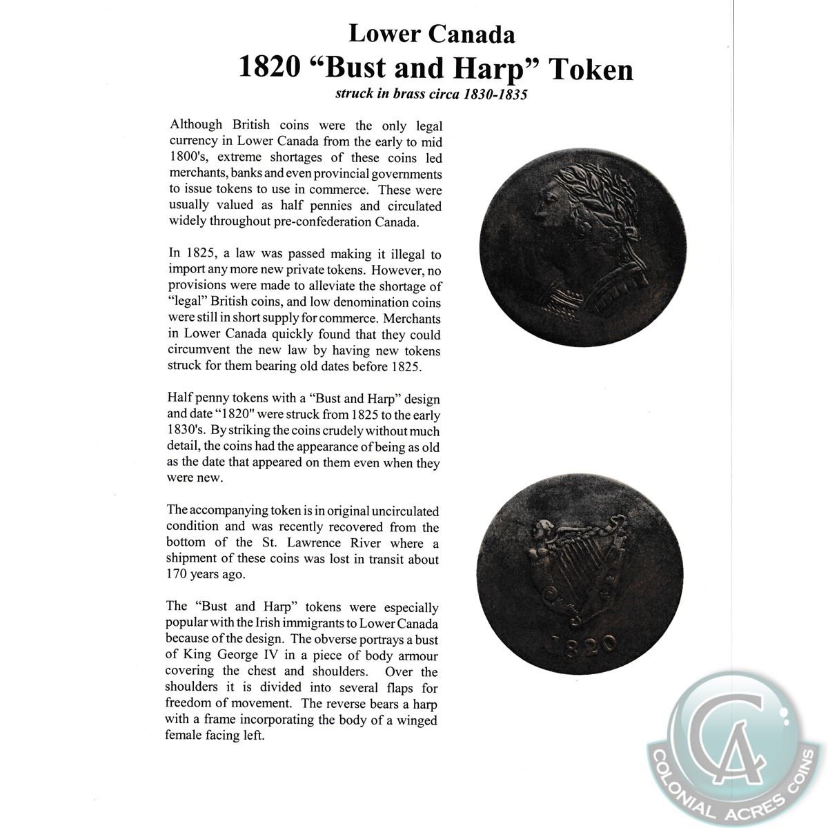 1820 Pre-Confederation Lower Canada "Bust and Harp" Token struck in brass, Circa 1830-1835 with informational Display card.