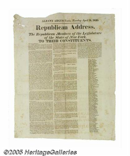 <B>1820 Pro-Daniel Tompkins New York Campaign Broadside</B></I> April 18, 1820, broadside promoting the New York gubernatorial campaign of Daniel Tompkins. Very fine. A huge size blank-back broadside measuring 22" x 18", one page, trivial scattered toning spots, some minor holes in the upper left and right corners, not affecting the text nor impairing the overall excellent appearance. Published as an <I>Albany Argus Extra</B></I> and as a decidedly pro-Tompkins piece. Apparently, an effort was being made to bring back Daniel Tompkins, former New York governor and DeWitt Clinton's predecessor, who had gone on to become Vice-President under James Monroe (fifth U.S. President 1817-1825). Unfortunately, Tompkins alienated his political friends along the way and a behind-the-scenes movement was begun to replace him as Vice-President in 1820. It was during this uncertain time that the New York Governorship was considered as a possible "out" for Tompkins. As it turned out, Clinton was reelected Governor and Tompkins was reelected as Vice-President, solving this political quagmire. Surprisingly enough, Clinton and Tompkins were once good friends and political confidants! Lot:255