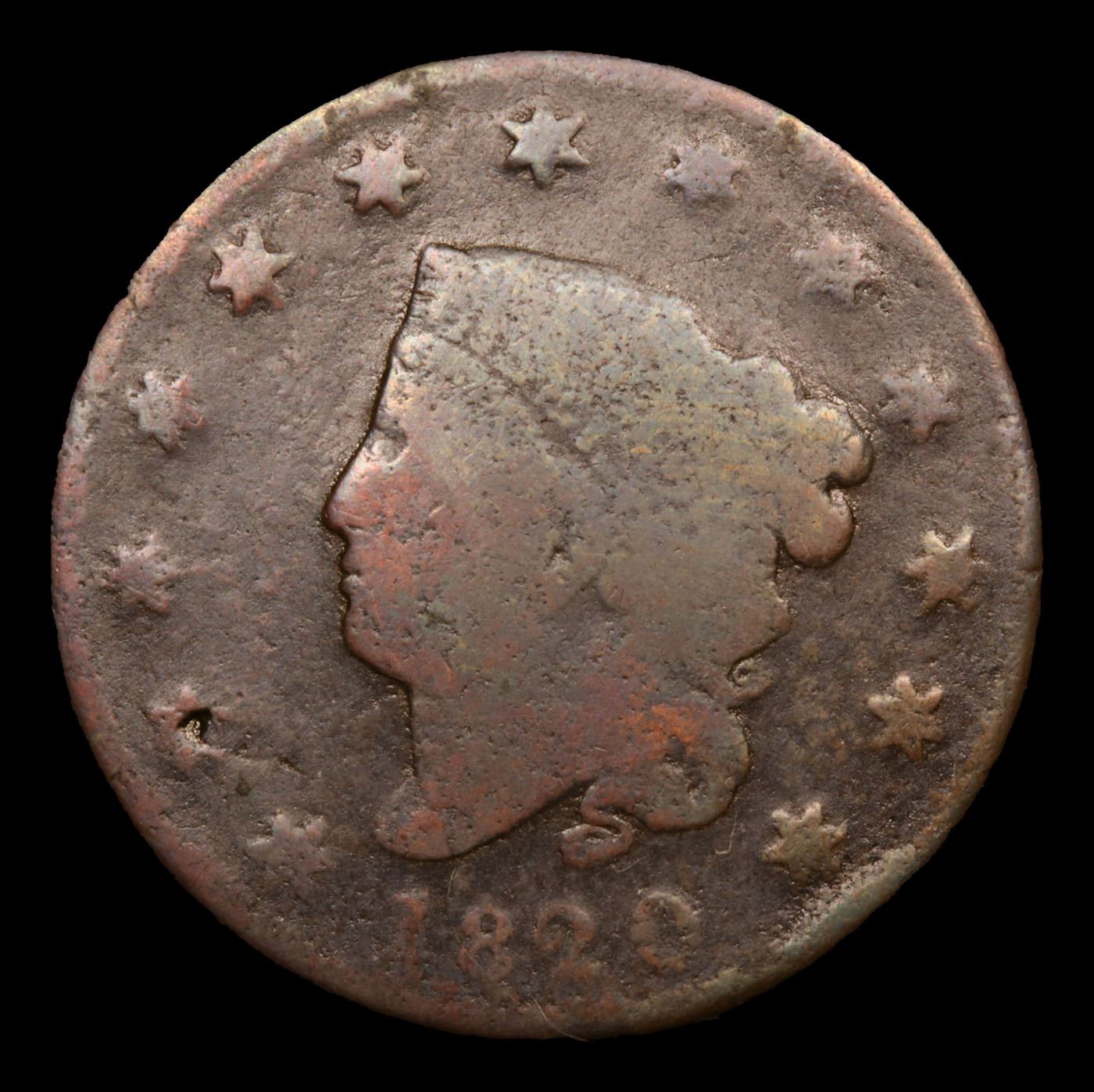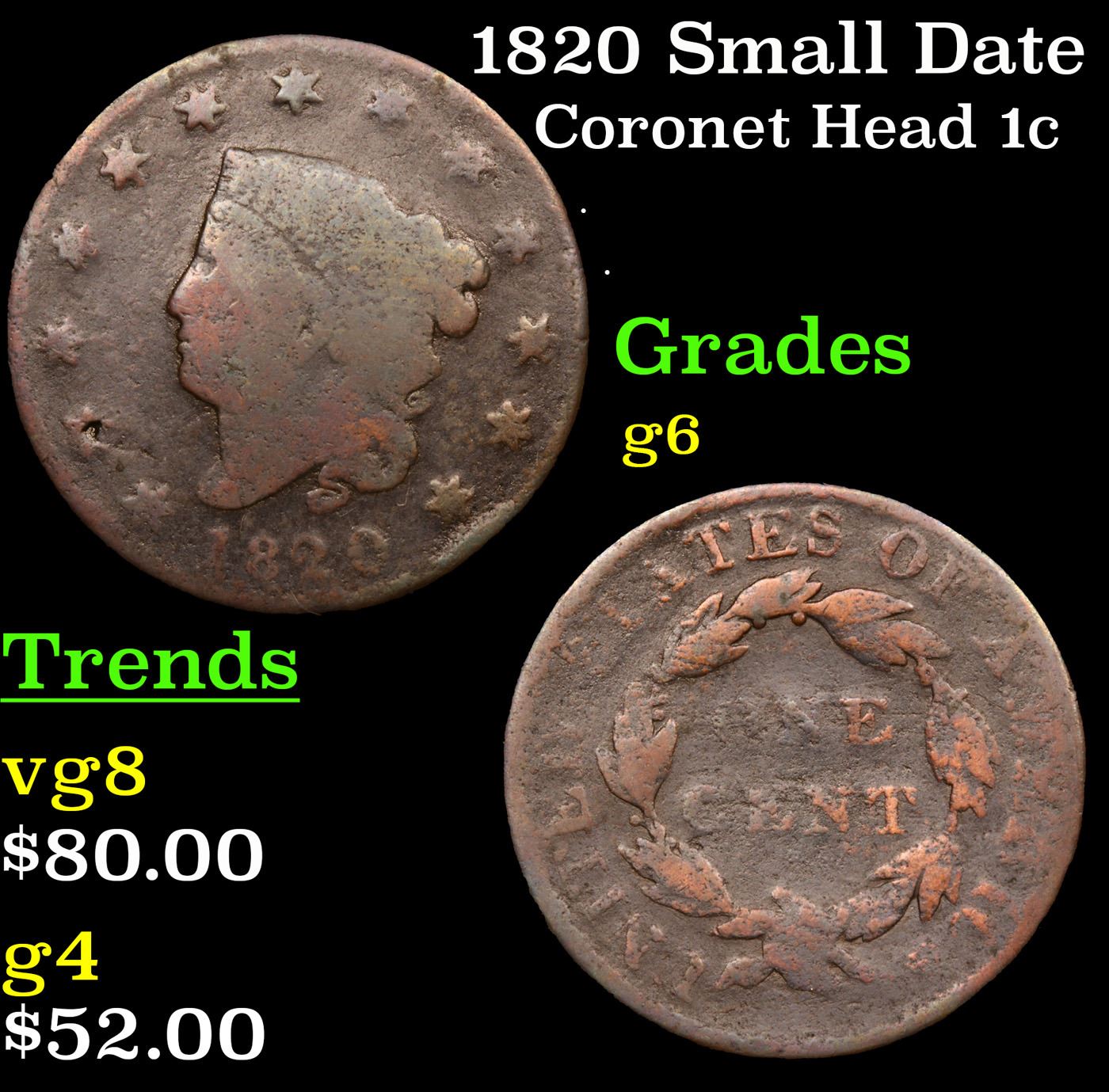 1820 Small Date Coronet Head Large Cent 1c Grades g+.
