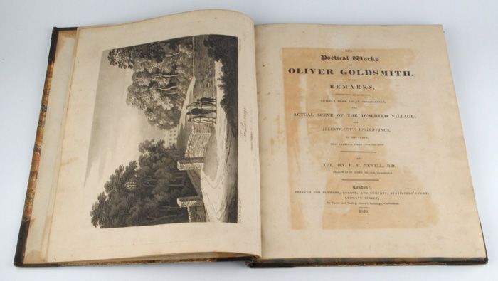 Suttaby, Evance & Company, London, 1820, quarter leather with marbled boards.The Poetical Works of Oliver Goldsmith. With Remarks, Attempting to Ascertain, Chiefly From Local Observation, The Actual Scene of the Deserted Village; and Illustrative Engravings, by Mr. Alkin, from Drawings Taken upon the Spot. by R.H.Newell. With six full page plates by Alkin.
