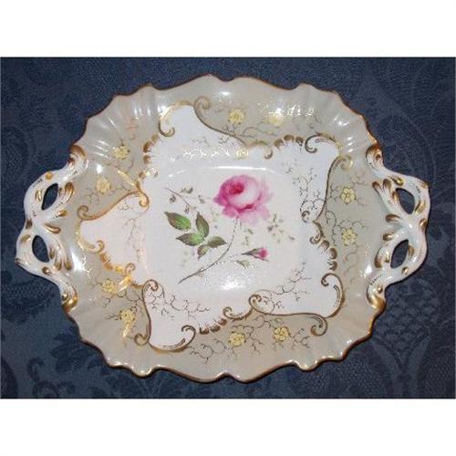 This is a exceptional early English Rococo Revival fluted hand painted dessert platter tray. Circa 1820's. It looks like Old Pris porcelain. It is handsomely painted in the center with a beautiful rose and rose bud. The grand color is gray with yellow flowers and gold gilt details on top of the ground color. On ether end are pierced Rococo branch handles with gold gilt highlights. The condition is good with only two small chips under the rim on this platter that can not be seen from above. The platter is not marked but could be by Ridgway, Nantgarw, Davenport, Minton, Spode or New Hall. 11" by 8" 1/2.