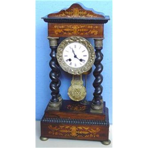French Empire Gong Chime Mantle Regulator Clock with nice satin inlay, gilt bronze mounts and barley twist columns. There is slight crazing and two small restorations to the enamel dial (see image) and several dial tiny worm holes to wooden frame, however, for a clock this old these are common and accepted condition, otherwise this timepiece is in excellent working condition and would make a nice addition to any fine collection or household.