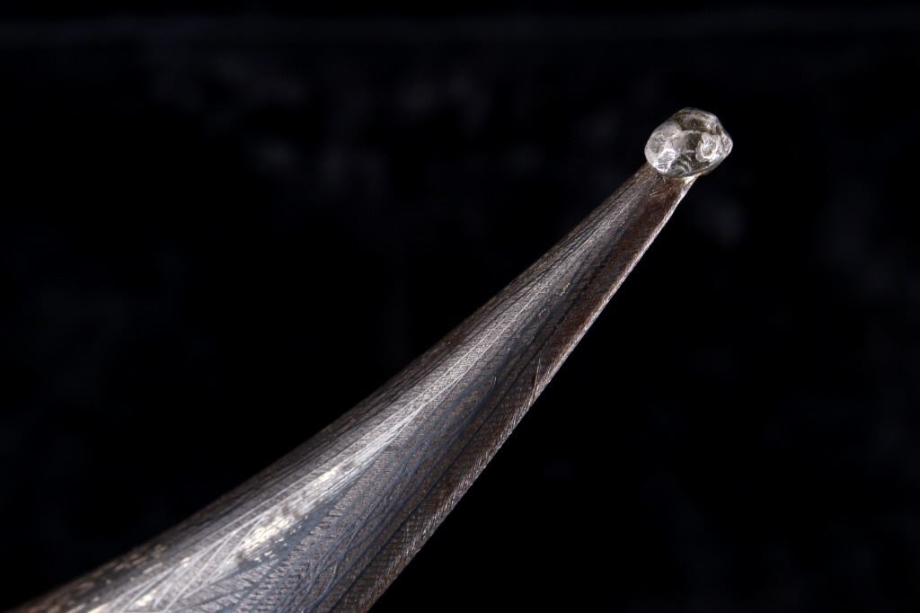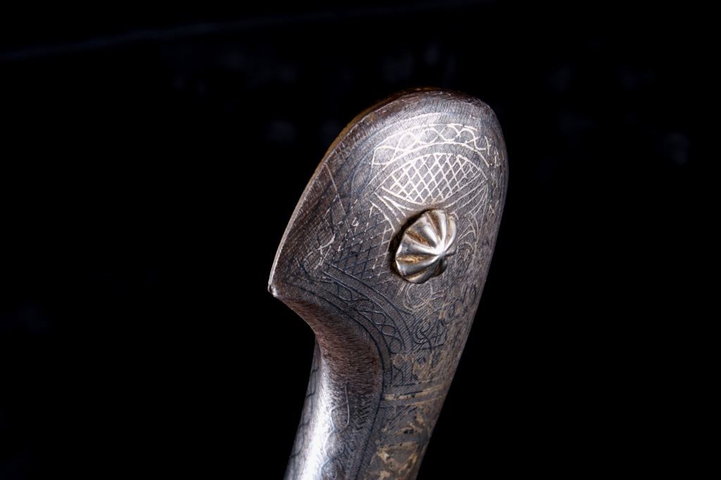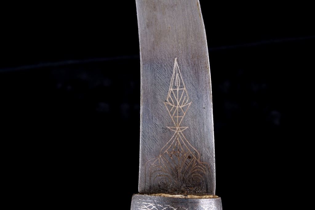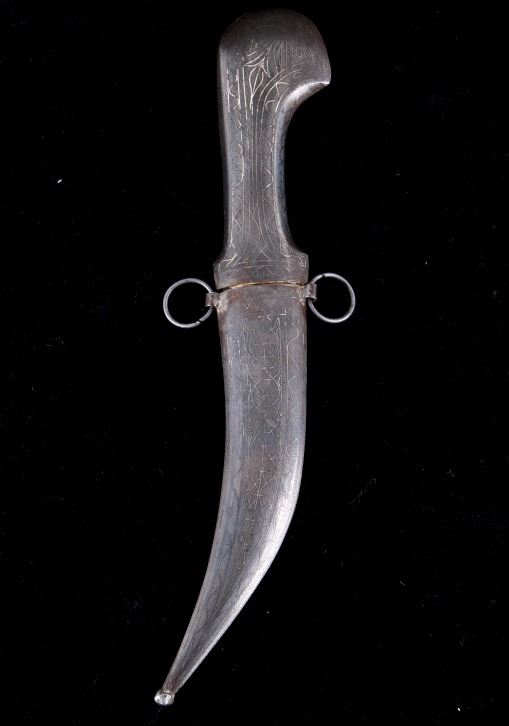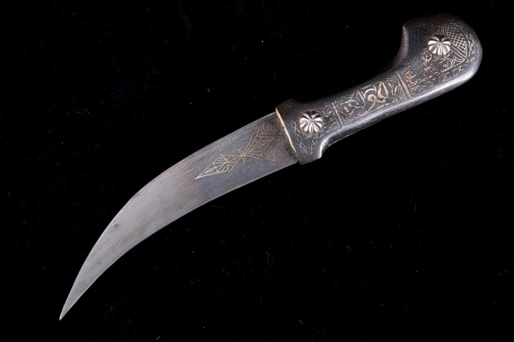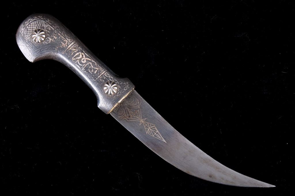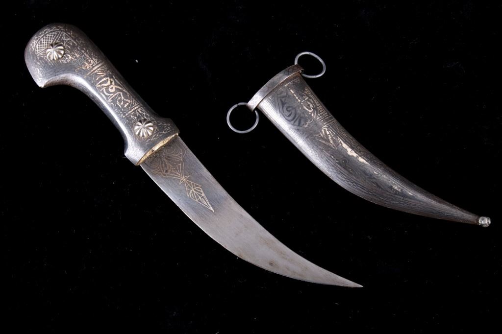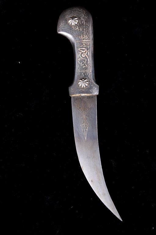 For your bidding pleasure is this Persian Khanjar dagger from the 1820's. This is a good example of Middle Eastern History here, showing a well crafted steel blade with intricate etched design that is decorated in traditional geometric patterns down the steel plated hilt encompassing a bone core. This blade slips easily but securely from a steel plated around a leather core sheath, with the same lovely patterns adorning the hilt. The measurements of this Khanjar are 10 3/4" x 3".