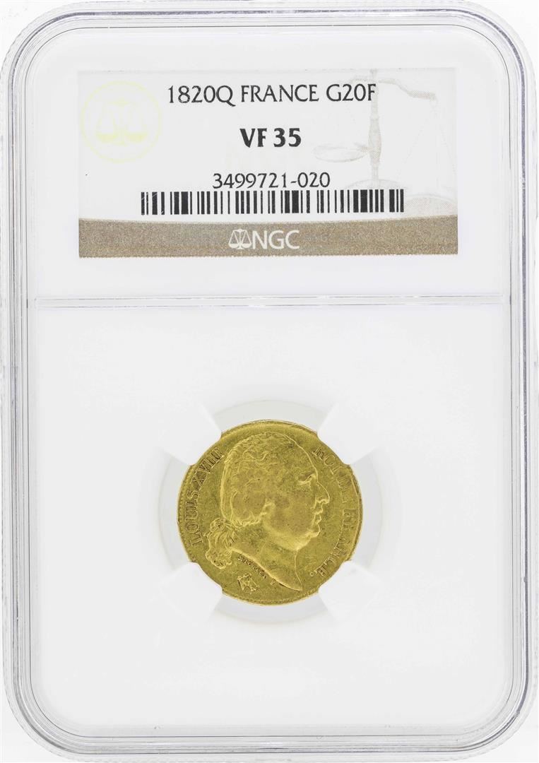 One 1820Q France 20 Francs Gold Coin NGC VF35. NGC Certified.