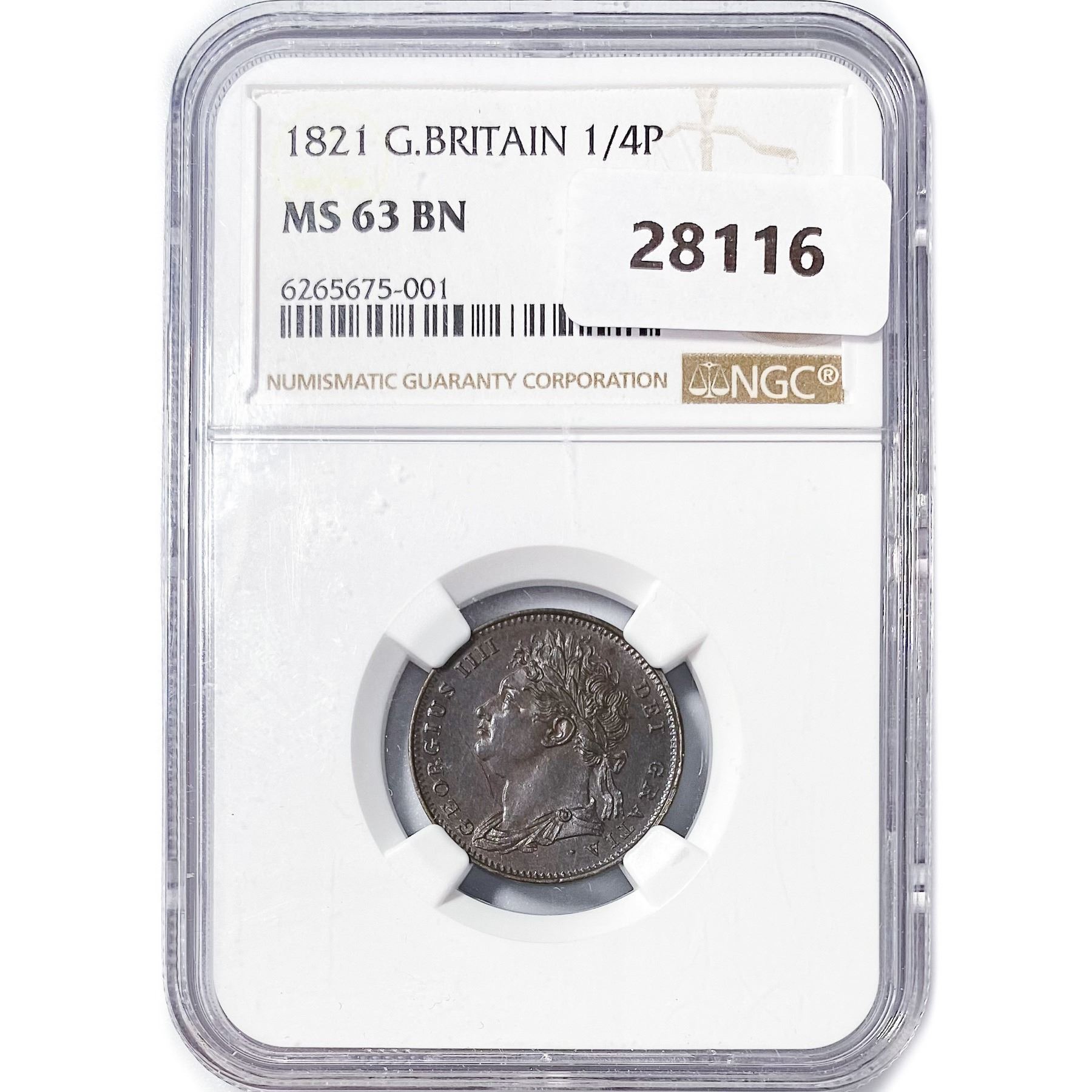 1821 1/4P G.Britain Copper NGC MS63 BN