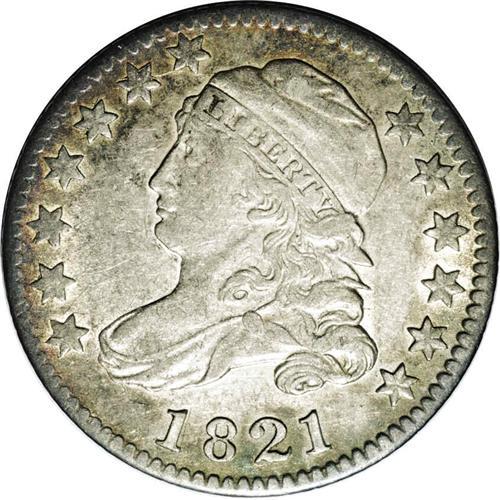 <B>1821<10C> Large Date JR-5, R.3. Reiver state a. AU55 NGC.</B></I> Dusty-gold and silver throughout, and quite lustrous. The strike shows the usual softness on Liberty's curls and the eagle's claws, but the neck and wing feathers are sharp. Trouble-free surfaces that show slight evidence of circulation. An excellent choice to represent this variety as few are seen so close to mint condition.<BR><I> No pedigree information included.</B></I> Envelope Included.