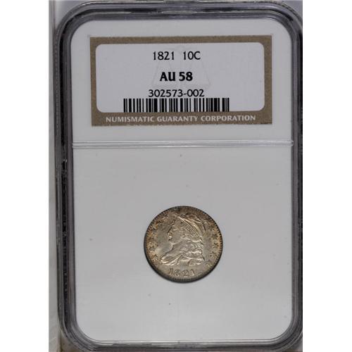 <B>1821<10C> Large Date AU58 NGC.</B></I> JR-1, R.2. Star 8 almost touches the cap, and a large period terminates the denomination. Considerable luster resides in the recesses of this well centered dime. Sharply struck, save for the lower stars. Whispers of gold-brown and lavender patina gravitate to the margins, and there are no distracting marks.