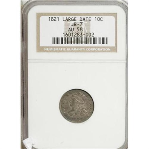 <B>1821 10C Large Date AU58 NGC.</B></I> JR-7, R.2. The second S in STATES is entered awkwardly high, diagnostic for this Large Date die pairing. An attentive strike brings out sharp definition on the design features of this light blue and yellow-gold specimen. A few light obverse marks are noted.<BR><BR><B>Coin Engraver:</B> John Reich<BR><BR><b>Shipping:</b> Coins & Currency (<a target="_blank" href="http://www.heritageauctions.com/common/shipping.php">view shipping information</a>)