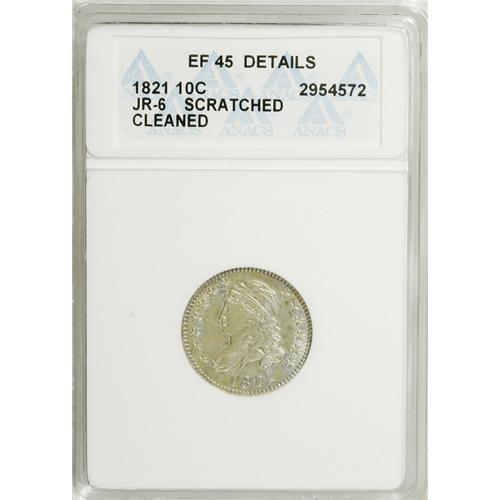 <B>1821 10C Large Date--Cleaned, Scratched--ANACS. XF45 Details.</B></I> JR-6. NGC Census: (14/153). PCGS Population (12/120). Mintage: 1,186,512. Numismedia Wsl. Price: $356. (#4496)<BR><BR><b>Shipping:</b> Coins & Currency (<a target="_blank" href="http://www.heritageauctions.com/common/shipping.php">view shipping information</a>)
