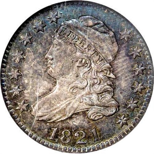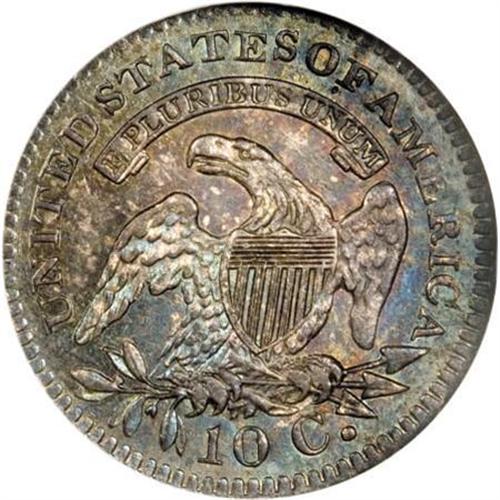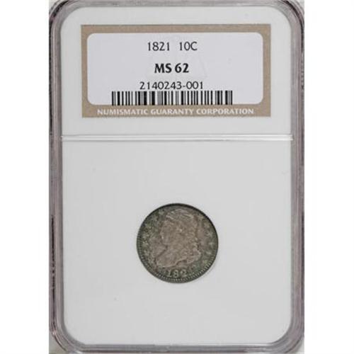 <B>1821 10C Large Date MS62 NGC.</B></I> JR-7, R.2. The second S in STATES is entered awkwardly high, diagnostic for this Large Date die pairing. Rich aquamarine and plum-red illuminate this flashy representative. Inspection beneath a loupe locates a few minor marks, but the eye appeal is irrefutable.<BR><BR><B>Coin Engraver:</B> John Reich<BR><BR><b>Shipping:</b> Coins & Currency (<a target="_blank" href="http://www.heritageauctions.com/common/shipping.php">view shipping information</a>)