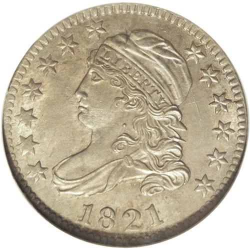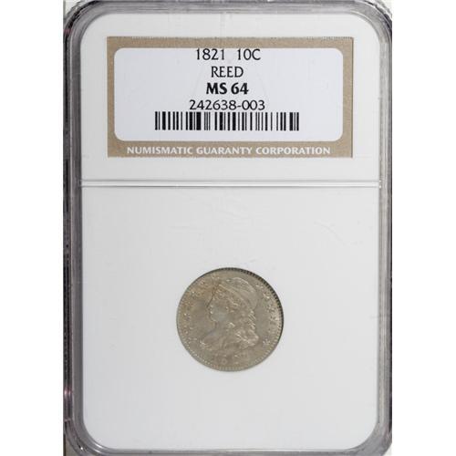 <B>1821 10C Large Date MS64 NGC.</B></I> Ex: Reed. JR-1, R.2. Light chestnut and powder-blue toning graces this satiny and generally smooth near-Gem. A thin vertical mark concealed near the top of the cap and a few minute slide marks on the chin are all that limit the grade. Byron Reed was a farsighted 19th century real estate investor who bequeathed his collection to Omaha, Nebraska. Census: 27 in 64, 12 finer (12/06).<BR><I>Ex: Byron Reed Collection (Christie's, 10/96), lot 279.</B></I><BR><BR><b>Shipping:</b> Coin/Currency (<a target="_blank" href="http://www.heritageauctions.com/common/shipping.php">view shipping information</a>)