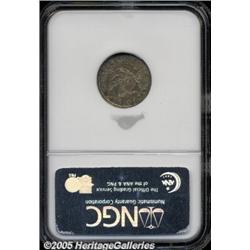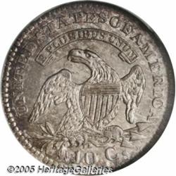 <B>1821 10C Large Date MS65 NGC.</B></I> JR-7, R.2. The JR-7 is one of the more frequently encountered varieties from 1821 in Uncirculated grades. However, that being said, it has been a while since we offered this variety in any grade; specifically, since the 2000 October Long Beach Sale. Even though occasionally available in mint condition, this MS65 must certainly rank at the top of the Condition Census. Well struck, except on several of the stars on the right side of the obverse, and on the upper ridge of the eagle's wing, this latter weakness may well be diagnostic for the variety. Variegated gray and lilac toning is seen over each side with somewhat deeper coloration at the margins, and there are several small patches of original brilliance that can still be made out with magnification. An outstanding toned Gem example of this early dime. Population: 8 in 65, 4 finer (2/05).