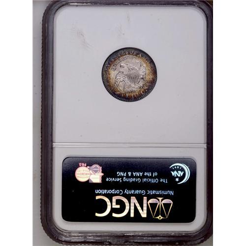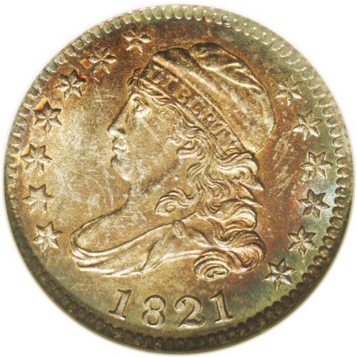 <B>1821<10C> Large Date MS66 NGC.</B></I> JR-5, R.3. This is an extraordinary opportunity for the advanced specialist. Although the JR-5 die marriage is not particularly rare, it is seldom found in Mint State grades. This impressive Gem is almost certainly the finest known of the variety, and it is tied with a few others for finest certified honors among all varieties of the date. The obverse has frosty luster hiding beneath intense gold, rose, and sea-green toning across the entire surface. The reverse has an untoned area at the center, surrounded by deepening rings of similar colors. Census: 4 in 66, 0 finer (5/06).