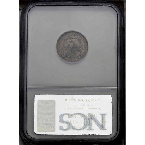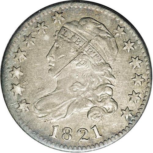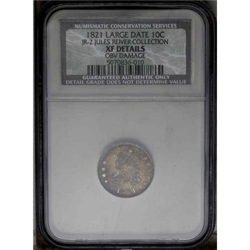 <B>1821<10C> Large Date JR-2, R.7. Reiver state a--Obverse Damage--NCS. XF Details..</B></I> The damage consists of a dull scratch from the left field across Liberty's face and cap through the E, another along the top of her bust, both converging on the first star. On the reverse there are several pin scratches on the devices and fields. Toned an attractive medium gray with peripheral blue highlights. Traces of luster are found in the fields. A very rare coin that is seldom offered in any grade, and while the present example is not the most perfect example, the high technical grade makes the problems more digestible.<BR><I>Ex: Steve Fischer (July 1992).</B></I> Envelope Included.