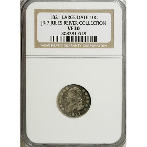 <B>1821 10C Large Date VF30 NGC.</B></I> JR-7. Ex: Jules Reiver Collection. NGC Census: (13/191). PCGS Population (6/152). Mintage: 1,186,512. Numismedia Wsl. Price for NGC/PCGS coin in VF30: $172. (#4496)<BR><BR><b>Shipping:</b> Coins & Currency (<a target="_blank" href="http://www.heritageauctions.com/common/shipping.php">view shipping information</a>)