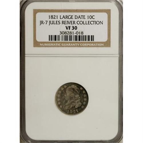 <B>1821 10C Large Date VF30 NGC.</B></I> JR-7. Ex: Jules Reiver Collection. NGC Census: (13/191). PCGS Population (6/152). Mintage: 1,186,512. Numismedia Wsl. Price for NGC/PCGS coin in VF30: $172. (#4496)<BR><BR><B>Coin Engraver:</B> John Reich<BR><BR><b>Shipping:</b> Coins & Currency (<a target="_blank" href="http://www.heritageauctions.com/common/shipping.php">view shipping information</a>\)