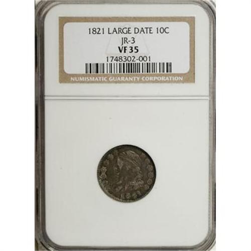 <B>1821 10C Large Date VF35 NGC.</B></I> JR-3. NGC Census: (3/180). PCGS Population (7/147). Mintage: 1,186,512. Numismedia Wsl. Price for NGC/PCGS coin in VF35: $254. (#4496)<BR><BR><B>Coin Engraver:</B> John Reich<BR><BR><b>Shipping:</b> Coins & Currency (<a target="_blank" href="http://www.heritageauctions.com/common/shipping.php">view shipping information</a>)
