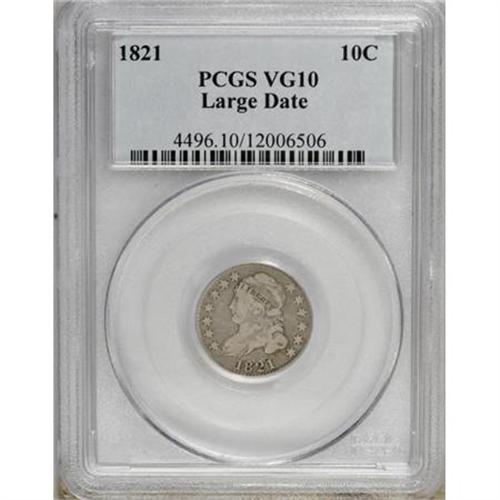 <B>1821 10C Large Date VG10 PCGS.</B></I> PCGS Population (1/171). NGC Census: (4/195). Mintage: 1,186,512. Numismedia Wsl. Price for NGC/PCGS coin in VG10: $34. (#4496)<BR><BR><B>Coin Engraver:</B> John Reich<BR><BR><b>Shipping:</b> Coins & Currency (<a target="_blank" href="http://www.heritageauctions.com/common/shipping.php">view shipping information</a>)
