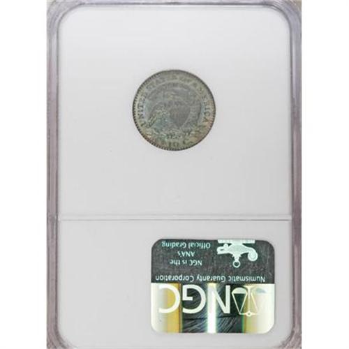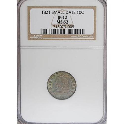 <B>1821 10C Small Date MS62 NGC.</B></I> JR-10, R.2. A Small Date variety with the final A in AMERICA distant from the arrowhead and the denomination well-centered. Attractively toned green-gold and lapis-blue with soft, pleasing luster. Well-defined save for the right obverse stars. For all Small Date varieties, Census: 3 in 62, 17 finer (10/07).<BR><BR><b>Shipping:</b> Coins & Currency (<a target="_blank" href="http://www.heritageauctions.com/common/shipping.php">view shipping information</a>)