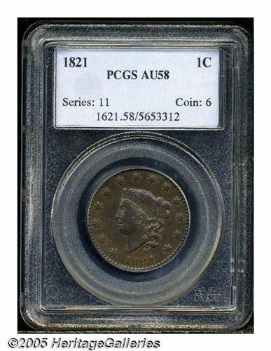 <B>1821<1C> AU58 PCGS.</B></I> N-1, R.1. This richly toned near-Mint representative exhibits substantial luster near the peripheries, and just a trace of highpoint wear on each side. Only a few trivial marks are evident, in the obverse and reverse field areas. A scarce, lower mintage, semi-key date in the Coronet Head series of Large Cents. Population: 6 in 58, 6 finer (4/05).