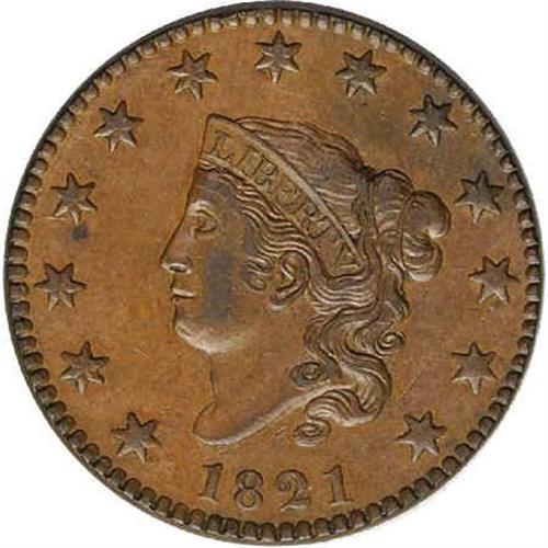 <B>1821<1C> N-1, R.1. AU58 NGC and EAC.</B></I> An early die state with only minor dentil crumbling within the obverse border over stars 6 and 7. The surfaces have a hint of reflectivity, and retain traces of faded mint color around some of the devices. Lovely golden-brown color over portions of each side, blended with darker chocolate-brown. Although the surfaces are lightly abraded, this is an exceptionally attractive example of the variety and the date. We believe that this example is among the top 20 known for this issue.<BR><I>Ex: George Ramont.</B></I> Envelope Included. <BR><BR><B>Important notice