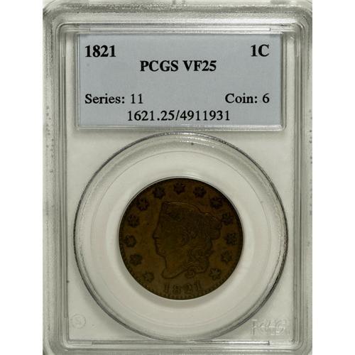 <B>1821 1C VF25 PCGS.</B></I> PCGS Population (10/62). NGC Census: (1/106). Mintage: 389,000. Numismedia Wsl. Price for NGC/PCGS coin in VF25: $553. (#1621)<BR><BR><b>Shipping:</b> Coins & Currency (<a target="_blank" href="http://www.heritageauctions.com/common/shipping.php">view shipping information</a>)