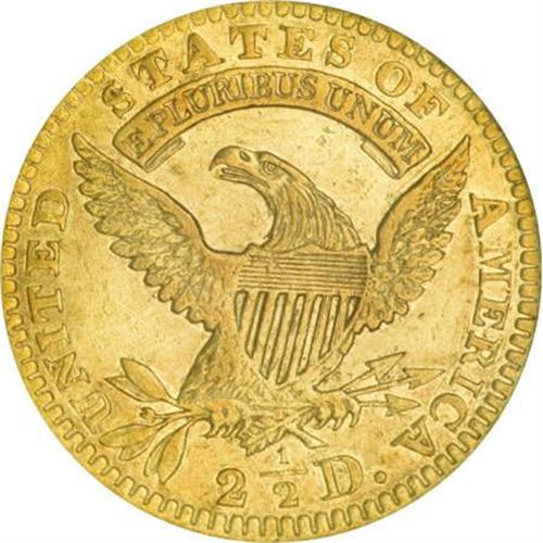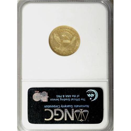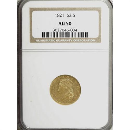 <B>1821 $2 1/2 AU50 NGC.</B></I> Breen-6126, Bass-3018, BD-1, R.5. This attractive example displays a substantial degree of semi-prooflikeness in the fields. The design features are boldly struck for the issue, with typical slight weakness noted on some of the obverse stars and on the eagle's leg feathers and talons, as well as on the vertical shield lines. Lime-gold coloration is imbued on the highpoints of each side with alluring accents of peach and rose. This was the first production of quarter eagles since 1808, and the mintage of 6,448 pieces was the highest for the new Capped Head to Left type (produced irregularly through 1834). According to Dannreuther-Bass (2006), however, survivors from this issue are rare, and they estimate that a mere 50 to 60 coins are extant. <BR><BR><B>Coin Engraver:</B> John Reich<BR><BR><b>Shipping:</b> Coins & Currency (<a target="_blank" href="http://www.heritageauctions.com/common/shipping.php">view shipping information</a>)
