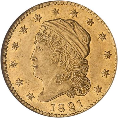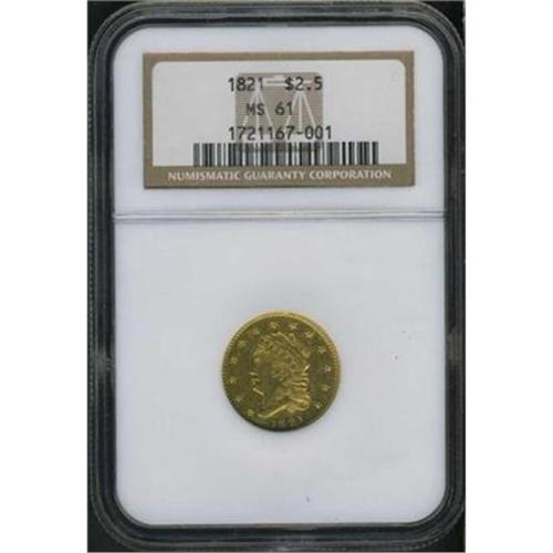 <b>1821 $2.50 Capped Head. NGC graded MS61.</b> NGC Pop: 4/5. After thirteen years of an absence of quarter eagles from the early mint, a few banks apparently began to ask that this denomination be produced again, possibly to be used as Christmas presents or souvenirs as Breen suggests. Robert Scot, then 77 years old, basing his design on the 1813 half eagle, translated it onto a smaller format for the $2.50 gold piece. The new coins were slightly smaller than in years past, 19 mm. very scarce. 20.6 mm, but the weight remained the same; placed side-by-side with a pre-1821 strike, there is a noticeable difference in the thickness of the planchets of this 1821 issue. The fields are gleaming and generally prooflike, as often seen; but the striking details are atypically soft on some stars. However, the central devices are quite crisp with all fine detail like the curls and feathers showing. A few hairlines and marks no doubt accounts for the Mint State 61 grade on this otherwise choice specimen. There are no heavy or distracting abrasions present that merit attention. Probably no more than a couple of dozen pieces of the 1821 quarter eagle exist today in all grades. In NGC holder #1721167-001.