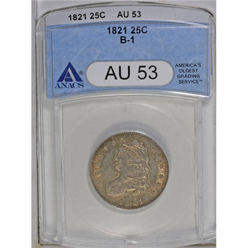 1821 25C AU53 ANACS. B-1, R.2. Lightly worn and well s