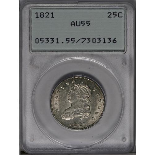 <B>1821<25C> AU55 PCGS.</B></I> B-1, R.2. Luster dominates the borders and devices. This cream-gray piece has no distracting marks, and strike softness is mostly limited to the LU in PLURIBUS. In a first generation holder.<BR><I>Ex: Set Shahbabian, M.D. Collection (Bowers and Merena, 1/96), lot 1386, which realized $1,045.</B></I><BR><I>From The Chief Paduke Collection.</B></I>