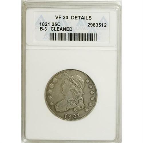 <B>1821 25C --Cleaned--ANACS. VF20 Details.</B></I> B-3. NGC Census: (2/149). PCGS Population (10/114). Mintage: 216,851. Numismedia Wsl. Price for NGC/PCGS coin in VF20: $292. (#5331)<BR><BR><b>Shipping:</b> Coins & Currency (<a target="_blank" href="http://www.heritageauctions.com/common/shipping.php">view shipping information</a>)