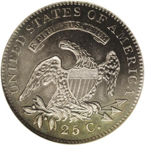 <B>1821<25C> MS62 NGC.</B></I> B-1, R.2. Easily spotted by the star 7 pointing to the top of the cap, while the first 1 in the date is higher than the second. A small spur on the second hair wave from the bottom behind the head, a bit above star 12, appears to be a star that has wandered off course. The centers are glossy silver, with a hint of gold, while the peripheries are blue-green. The strike is a bit light on the central highpoint hair, and on the eagle's claws, the right (facing) wing, and RIBU in the motto. Census: 7 in 62, 33 finer (3/06).