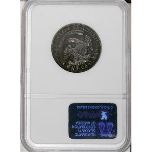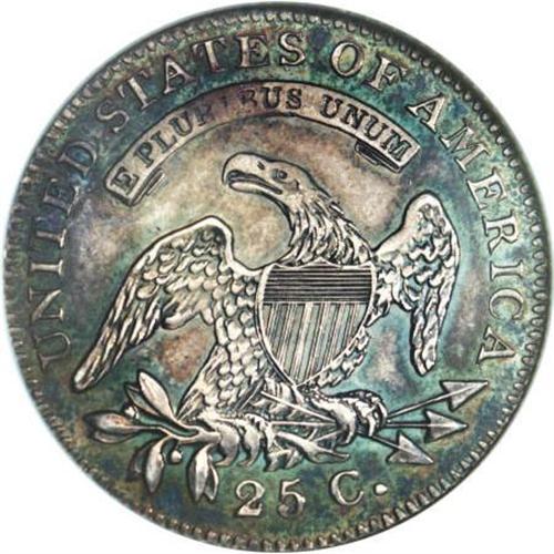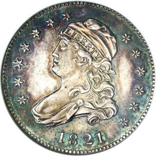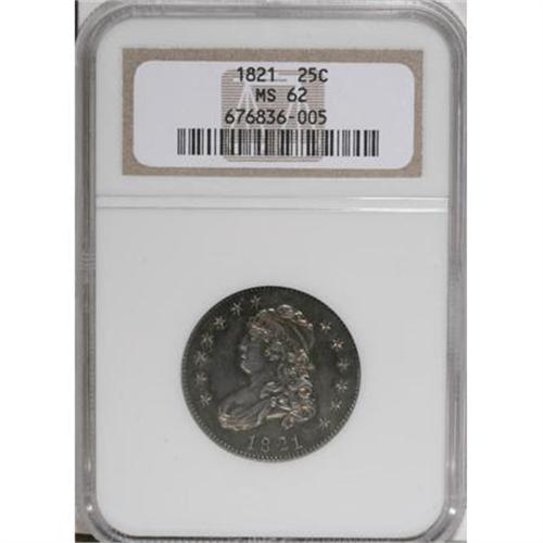 <B>1821 25C MS62 NGC.</B></I> B-2, R.4. The second T in STATES is directly aligned with the I in PLURIBUS, diagnostic for this very scarce 1821 Browning variety. This well detailed and glossy Capped Bust quarter features iridescent forest-green, violet, and sky-blue toning. A small planchet flaw (as made) on the field near the neck provides an identifier.<BR><BR><B>Coin Engraver:</B> John Reich<BR><BR><b>Shipping:</b> Coins & Currency (<a target="_blank" href="http://www.heritageauctions.com/common/shipping.php">view shipping information</a>)