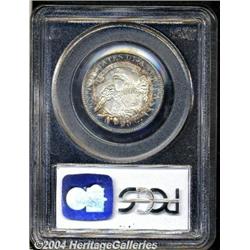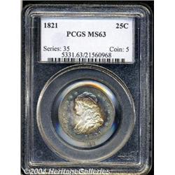<B>1821<25C> MS63 PCGS.</B></I> B-1, High R.2. A visually captivating Capped Bust Quarter that displays bright, frosty-white centers outlined in cobalt-blue and russet toning. Look for stiff competition on this Select representative of an already unheralded early type. Population: 9 in 63, 21 finer (3/04).<BR><I>Ex: Quality Sales Corp., A. Kreisberg, Cohen Sale (6/68), lot 691, where it realized $327.</B></I> <BR><BR><B>Important notice:</B> Heritage usually auctions material at the rate of 200-250 lots per hour. On some occasions eBay Live bid software or the Internet may not be able to keep up with the pace of the auction. We recommend placing a realistic absentee bid now as insurance to avoid disappointment. Occasionally the auctioneer may eliminate or reject an eBay Live bid, and the auctioneer may also reopen a lot after the close of the eBay live bidding (usually because we missed an audience bid), and may reject your bid even if it shows you as the winning bidder. By bidding via eBay Live, you agree that Heritage may award the lot to another bidder at its sole discretion under the circumstances described above or any other reasonable circumstances. Since eBay bids are not shown to us until we open the lot on the floor, we treat those bids just like floor bids. In most cases the floor responds before the eBay bid is presented to us, due to Internet lag time, so for consistency we have made it a policy that floor bids are always considered first over tie eBay live bids. Also please note that all Heritage lots purchased through eBay Live carry a 20% Buyer's Premium. Please make sure you read the Terms and Conditions before you bid.