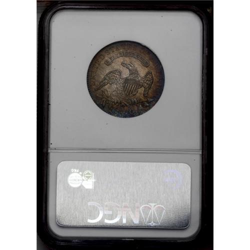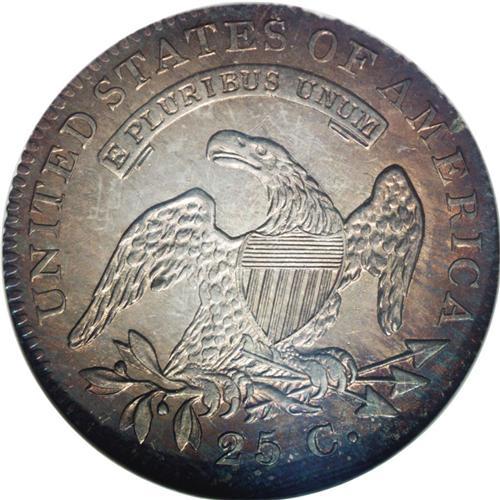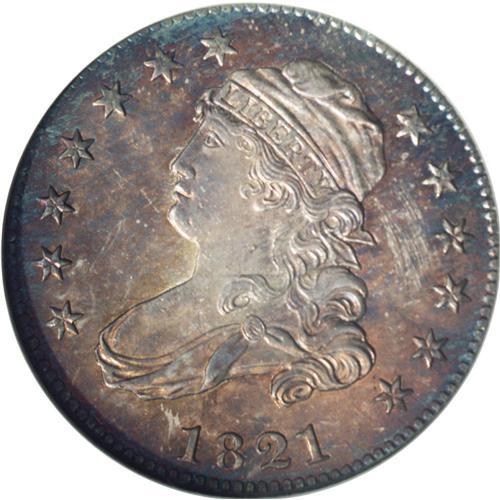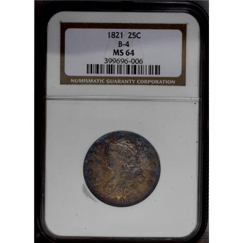 <B>1821<25C> MS64 NGC.</B></I> B-4, R.3. Electric-blue, apricot, and battleship-gray toning drapes this satiny near-Gem. Well struck except for the claws and a few of the upper stars. Thorough evaluation with a loupe locates only a small number of wispy slide marks on the obverse field. B-1 and B-3 are the most available varieties for the year, and a high grade example of the Browning-4 marriage is of obvious interest to the advanced specialist.<BR><I>From The Lake Highlands Collection.</B></I> <BR><BR><B>Importa