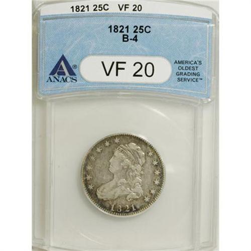 <B>1821 25C VF20 ANACS.</B></I> B-4. NGC Census: (2/149). PCGS Population (10/114). Mintage: 216,851. Numismedia Wsl. Price for NGC/PCGS coin in VF20: $292. (#5331)<BR><BR><b>Shipping:</b> Coins & Currency (<a target="_blank" href="http://www.heritageauctions.com/common/shipping.php">view shipping information</a>)