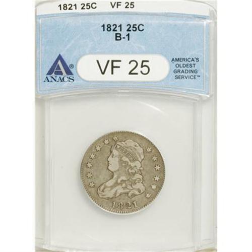 <B>1821 25C VF25 ANACS.</B></I> B-1. NGC Census: (4/146). PCGS Population (9/114). Mintage: 216,851. Numismedia Wsl. Price for NGC/PCGS coin in VF25: $385. (#5331)<BR><BR><B>Coin Engraver:</B> John Reich<BR><BR><b>Shipping:</b> Coins & Currency (<a target="_blank" href="http://www.heritageauctions.com/common/shipping.php">view shipping information</a>)