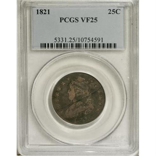 <B>1821 25C VF25 PCGS.</B></I> PCGS Population (7/107). NGC Census: (4/144). Mintage: 216,851. Numismedia Wsl. Price for NGC/PCGS coin in VF25: $375. (#5331)<BR><BR><b>Shipping:</b> Coins & Currency (<a target="_blank" href="http://www.heritageauctions.com/common/shipping.php">view shipping information</a>)