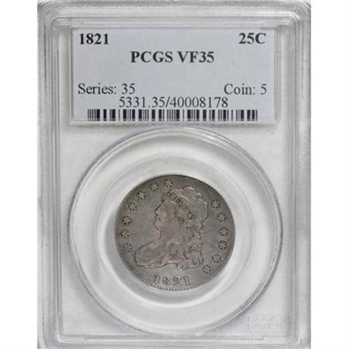 <B>1821 25C VF35 PCGS.</B></I> B-3, R.2. Breen Die State II. The die crack between star 12 and the portrait is heavy. Slate-gray and almond-gold with gunmetal-blue highpoints. A pleasing, problem-free example.<BR><BR><b>Shipping:</b> Coins & Currency (<a target="_blank" href="http://www.heritageauctions.com/common/shipping.php">view shipping information</a>)