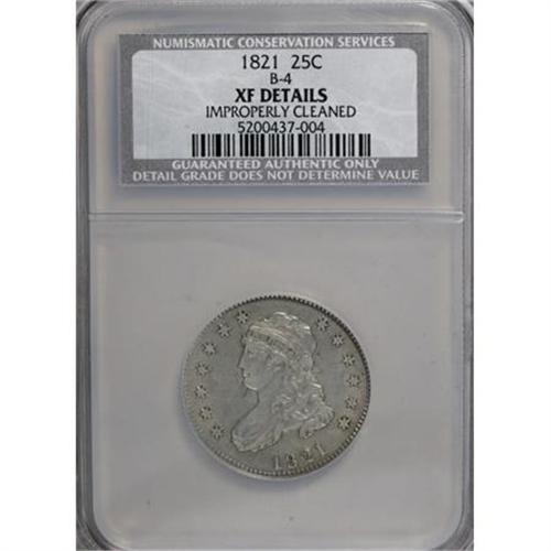 <B>1821 25C --Improperly Cleaned--NCS. XF Details. B-4.</B></I> NGC Census: (13/109). PCGS Population (10/89). Mintage: 216,851. Numismedia Wsl. Price for NGC/PCGS coin in XF40: $1,010. (#5331)<BR><BR><B>Coin Engraver:</B> John Reich<BR><BR><b>Shipping:</b> Coins & Currency (<a target="_blank" href="http://www.heritageauctions.com/common/shipping.php">view shipping information</a>)