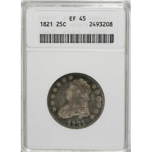 <B>1821 25C XF45 ANACS.</B></I> B-4, R.3. An early die state with faint obverse clash marks but no indication of reverse clash marks, and no die cracks. Light ivory color on the devices and in the fields, surrounded by deeper steel toning along the borders.<B><BR></B></I><I>From The Beau Clerc Collection.</B></I><BR><BR><B>Coin Engraver:</B> John Reich<BR><BR><b>Shipping:</b> Coins & Currency (<a target="_blank" href="http://www.heritageauctions.com/common/shipping.php">view shipping information</a>)