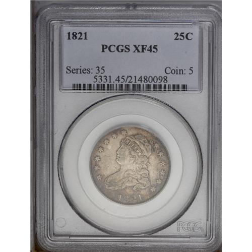 1821 25C XF45 PCGS. B-4, R.3. The cobalt-blue and gold 1821[25C] XF45 PCGS.