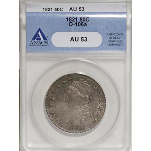 <B>1821 50C AU53 ANACS.</B></I> O-106a. NGC Census: (37/236). PCGS Population (38/213). Mintage: 1,305,797. Numismedia Wsl. Price for NGC/PCGS coin in AU53: $565. (#6128)<BR><BR><B>Coin Engraver:</B> John Reich<BR><BR><b>Shipping:</b> Coins & Currency (<a target="_blank" href="http://www.heritageauctions.com/common/shipping.php">view shipping information</a>)