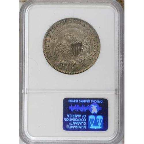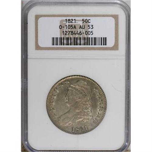 <B>1821 50C AU53 NGC. </B></I>O-105a. NGC Census: (37/233). PCGS Population (33/205). Mintage: 1,305,797. Numismedia Wsl. Price for NGC/PCGS coin in AU53: $550. (#6128)<BR><BR><B>Coin Engraver:</B> John Reich<BR><BR><b>Shipping:</b> Coins & Currency (<a target="_blank" href="http://www.heritageauctions.com/common/shipping.php">view shipping information</a>\)