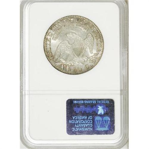 <B>1821 50C AU53 NGC.</B></I> O-105a, R.1. An attractive silver-gray example with lovely turquoise and golden-brown toning at the peripheries. Well struck with substantial luster and scattered hairlines on each side. <BR><BR><B>Coin Engraver:</B> John Reich<BR><BR><b>Shipping:</b> Coins & Currency (<a target="_blank" href="http://www.heritageauctions.com/common/shipping.php">view shipping information</a>)