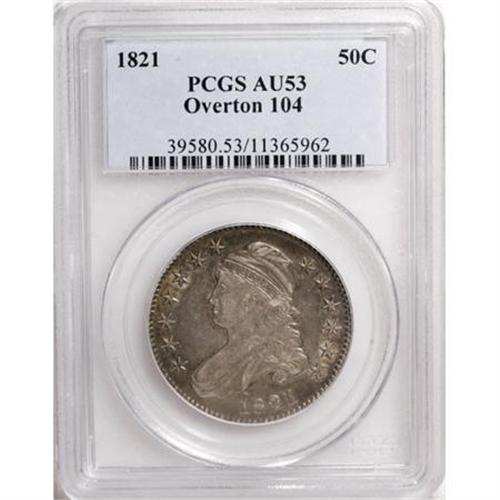 <B>1821 50C AU53 PCGS.</B></I> O-104. PCGS Population (38/213). NGC Census: (37/236). Mintage: 1,305,797. Numismedia Wsl. Price for NGC/PCGS coin in AU53: $550. (#6128)<BR><BR><B>Coin Engraver:</B> John Reich<BR><BR><b>Shipping:</b> Coins & Currency (<a target="_blank" href="http://www.heritageauctions.com/common/shipping.php">view shipping information</a>)